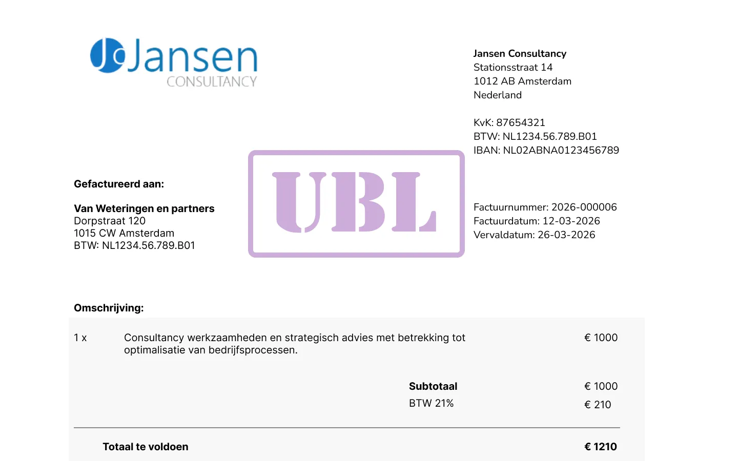 Bij elektronische facturen (UBL e-facturen) worden alle gegevens automatisch overgenomen. Net als ScanPilot AI voorkomt dit fouten in je administratie omdat je niets zelf meer hoeft over te typen.
