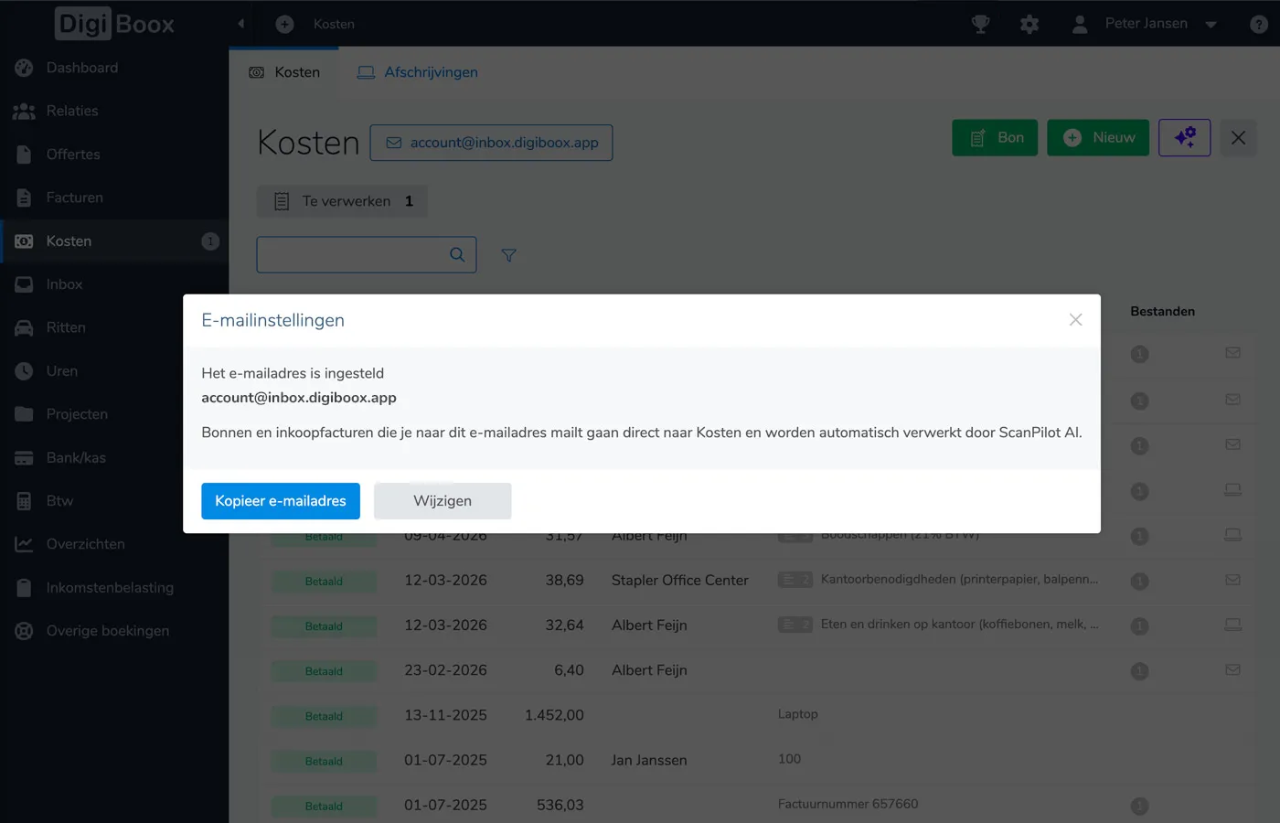 Ontvang je facturen digitaal? Stuur ze door naar je persoonlijke DigiBoox-adres. ScanPilot AI verwerkt ze automatisch, net als je bonnetjes.